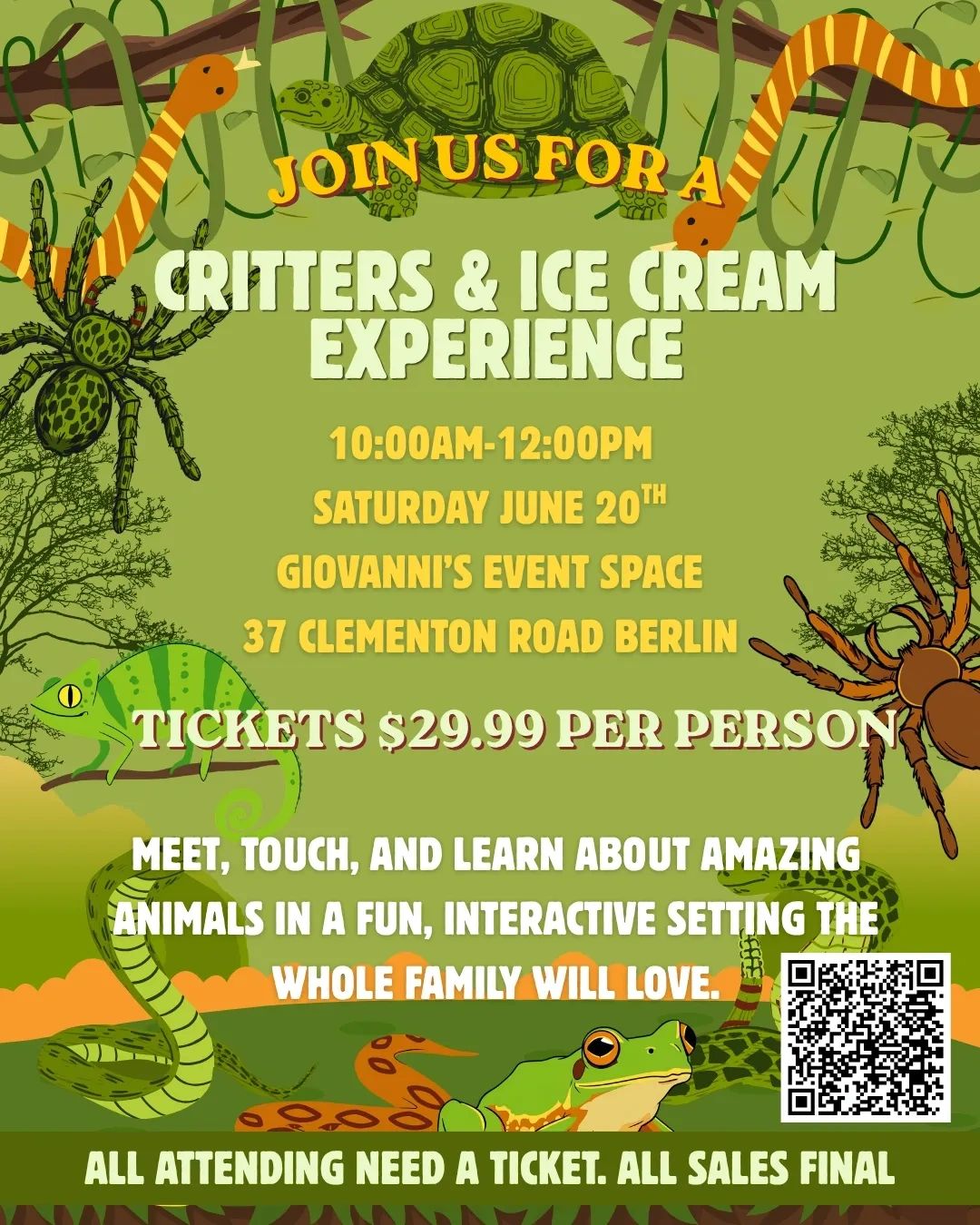 Join us June 20th from 10–12 at Giovanni’s Event Space for a hands-on animal encounter with Tori’s Critters LLC! Meet, touch, and learn about amazing animals in a fun, interactive setting the whole family will love.